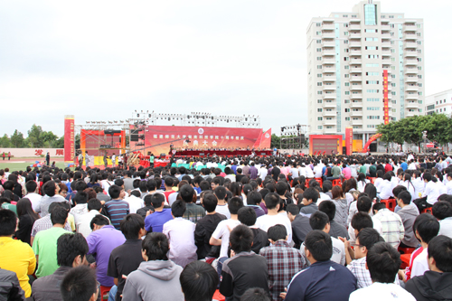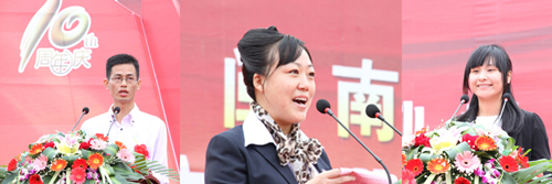 上午10时,庆典大会开始,田径场响起雄壮的中华人民共和国国歌,整个校园沉浸在庄严隆重而又热烈喜庆的气氛中。
