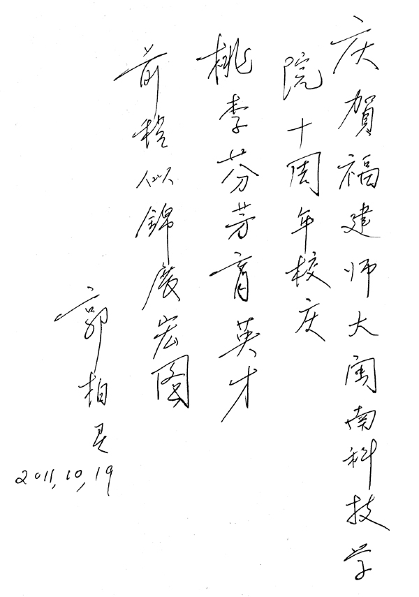 10月19日,我院院长郭丹教授拜会中国科学院院士郭柏灵教授。郭丹院长向郭柏灵院士汇报了学院建设发展情况,热情邀请参加学院十周年庆典。郭院士欣然应允,并当即为我院校庆题词:庆贺福建师范大学开云官方网页版_开云(中国)十周年校庆——桃李芬芳育英才,前程似锦展宏图。