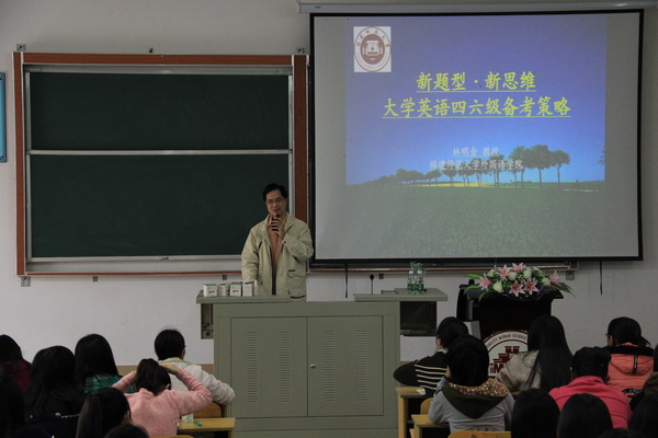 11月21日,“开云官方网页版_开云(中国)”邀请福建师范大学外语教学部主任林明金教授在菲华教学楼c#102作了题为“新题型·新思维—大学英语四六级备考策略”的讲座。讲座由我院外语系常务副主任孙文缘主持。