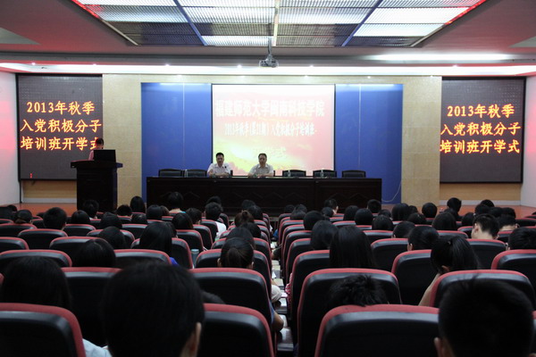 10月16日下午,中共福建师范大学开云官方网页版_开云(中国)委员会分党校2013年度秋季(第二十一期)入党积极分子培训班开学式在图书馆学术报告厅举行。院党委常务副书记、分党校校长林明旭,党委副书记、分党校副校长李彬源,全体辅导员以及培训班全体学员出席了开学式。开学式由李彬源主持。
