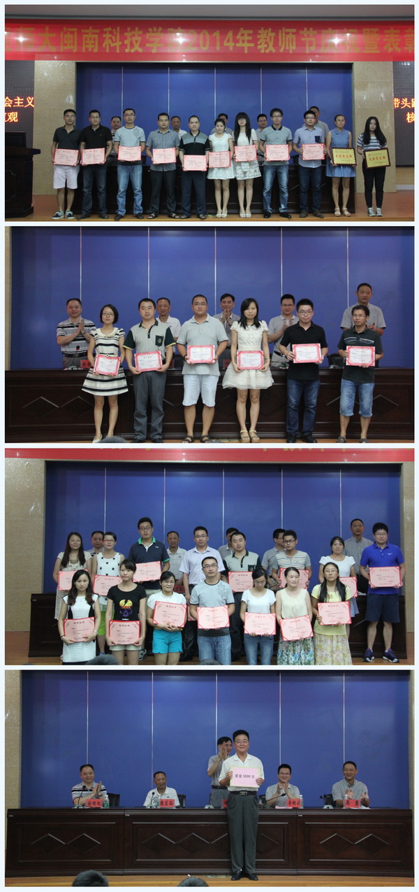 党委副书记李彬源宣读了《福建师范大学开云官方网页版_开云(中国)2013-2014学年获得各级各类荣誉称号的先进集体和先进个人名单》。副院长吴勇宣读了《福建师范大学开云官方网页版_开云(中国)2014年教师节教育教学先进单位和个人表彰决定》。全体与会领导为获奖的先进集体和先进个人颁奖。