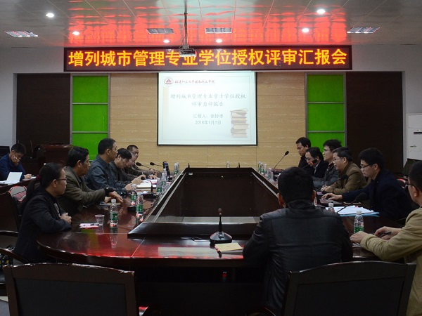 在评审汇报会上,邱永渠院长简要介绍了学院的基本概况,并从城市管理专业办学规模、师资力量、招生情况等方面作了简要汇报。评审专家组听取了城市管理专业负责人张铃枣教授的《增列城市管理专业学位授权评审自评报告》。